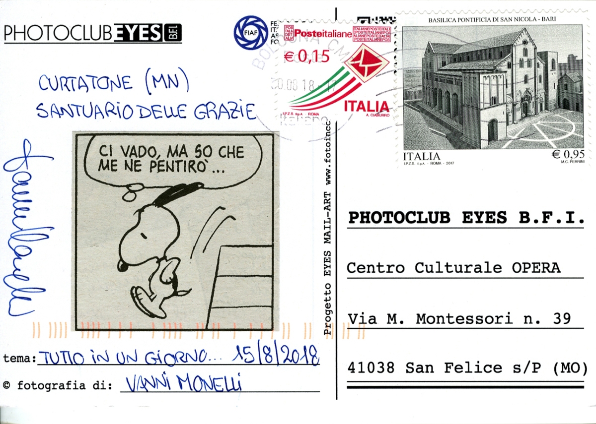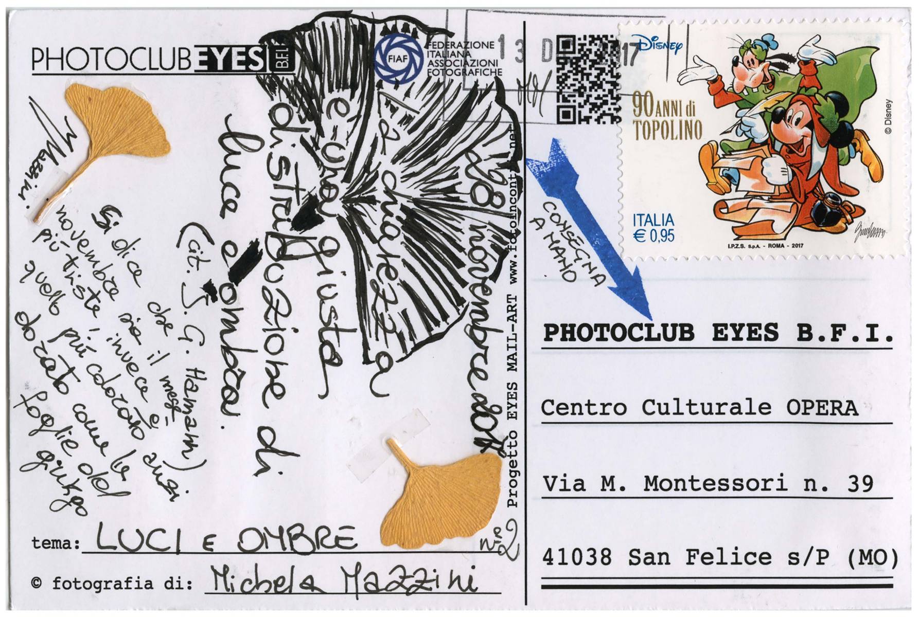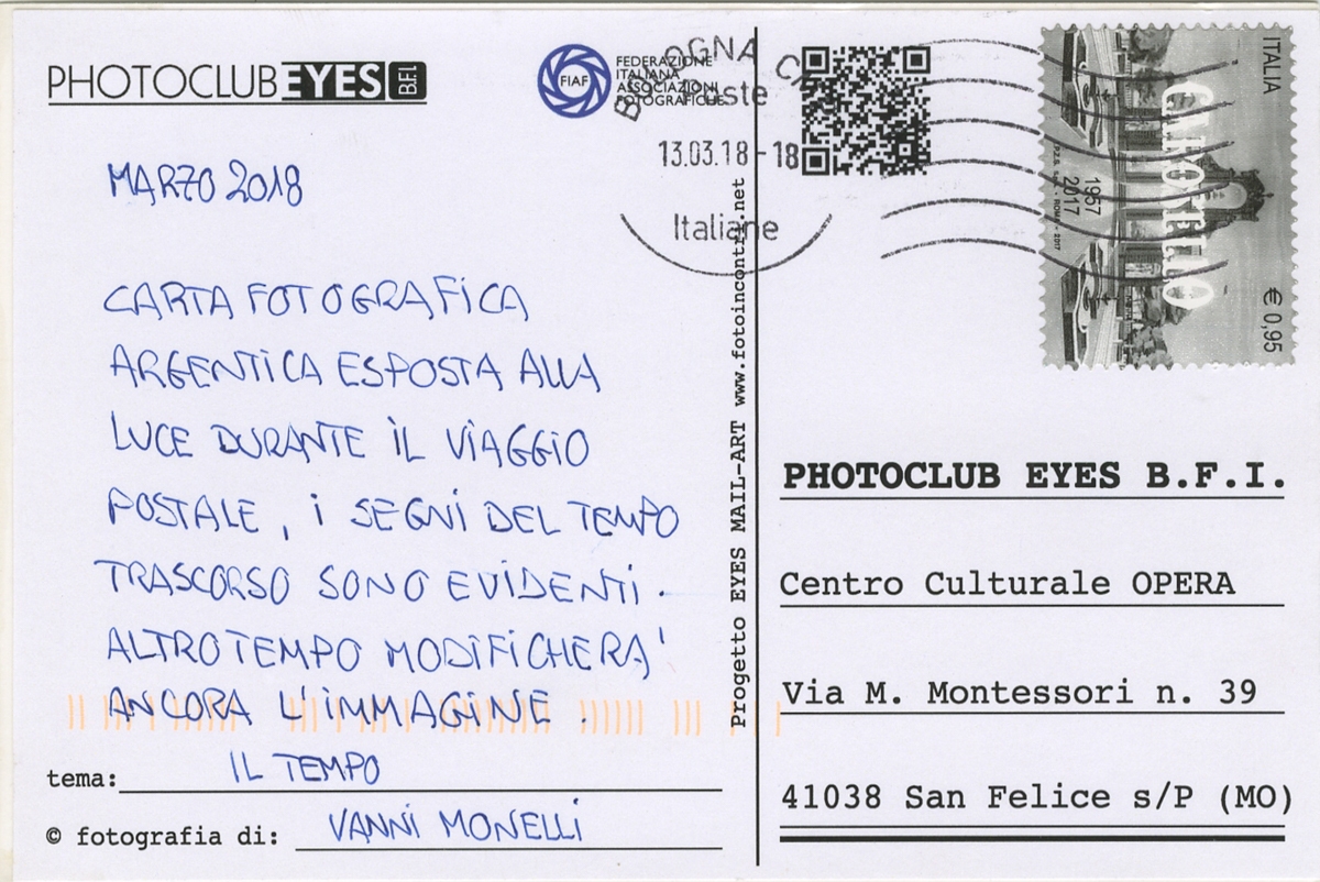 L’opera fotografica, in questo caso la cartolina, pensata, realizzata e stampata è accompagnata da una presentazione, una citazione o anche una riflessione che aggiungono valore all’opera stessa, facilitano la lettura dell’immagine e dichiarano le intenzioni dell’autore. Infine c’è il viaggio, quasi liberatorio per l’immagine che, anziché rimanere latente nella memoria di un PC o di un hard disk o chiusa in un cassetto, viene spedita, manipolata, maltrattata, subisce gli sgarri meccanici delle distributrici di posta, gli insulti del meteo e finalmente giunge a destinazione dove viene sempre accolta con gioia e calore, viene vista, commentata, catalogata ed esposta… mai un’opera fotografica, che non sia una mail-art, ha compiuto tanti passaggi. Questo è il valore aggiunto di queste immagini che si arricchiscono di segni anche nel corso del viaggio, segni dettati dal caso e irripetibili che rendono unica l’opera.